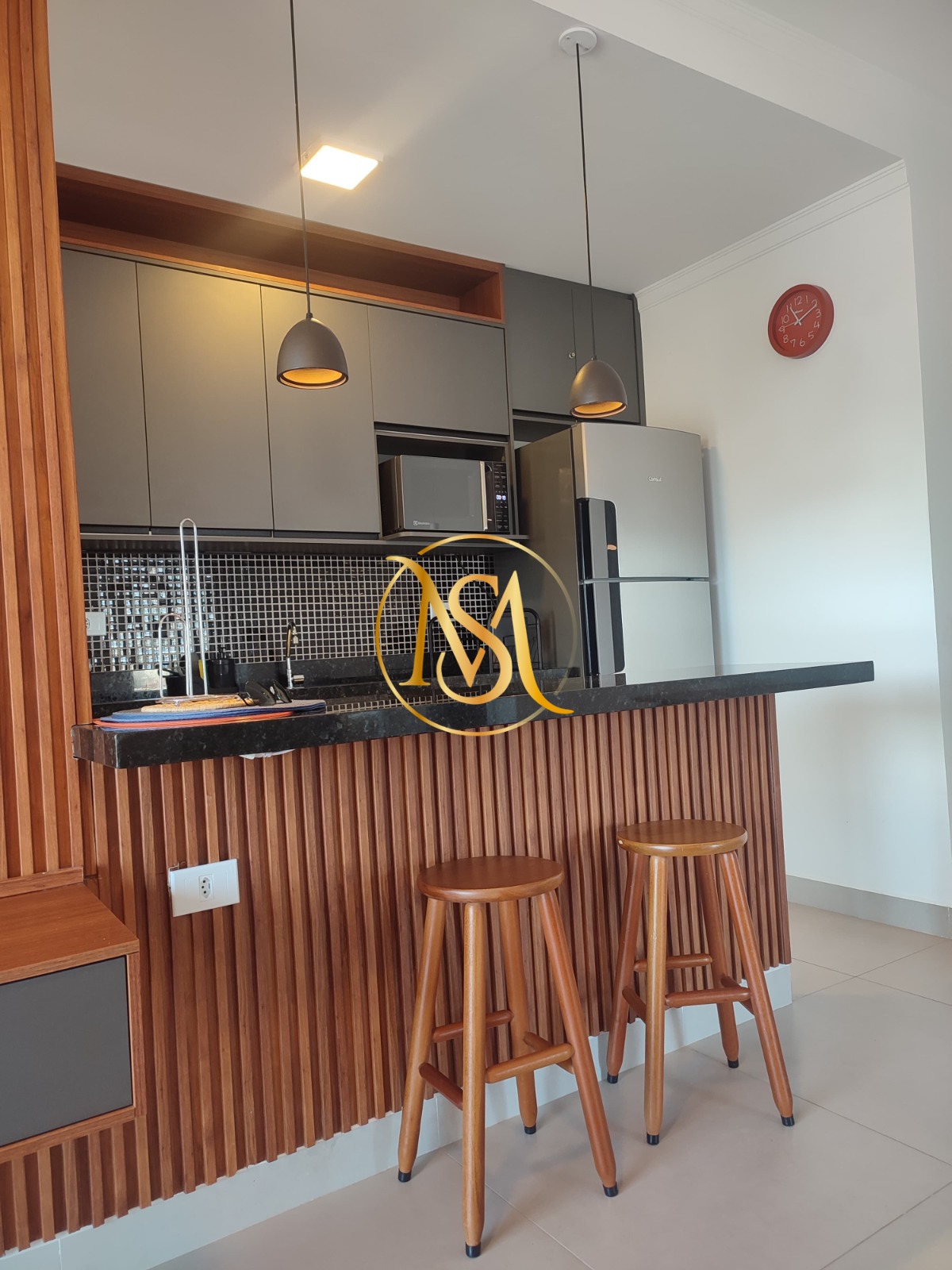 O imóvel é mobiliado e possui armários embutidos, além de um armário de cozinha que otimiza o espaço.